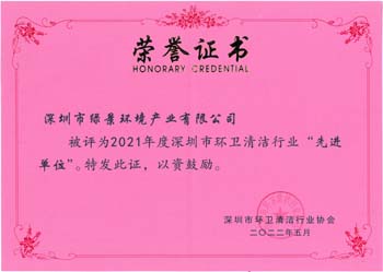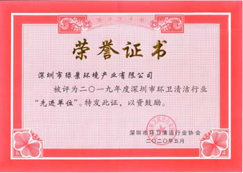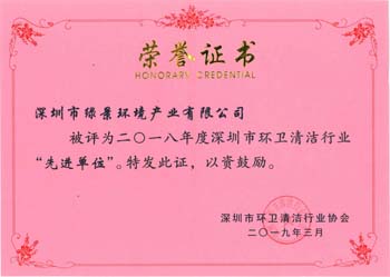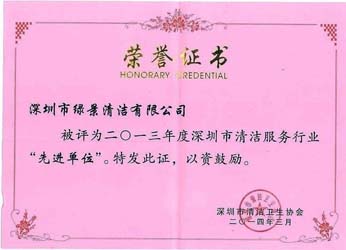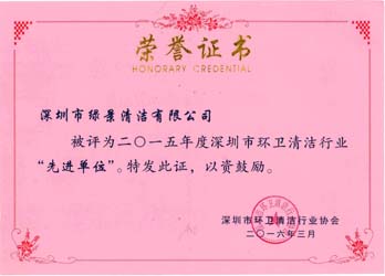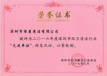 深圳市清洁服务行业先进单位荣誉证书