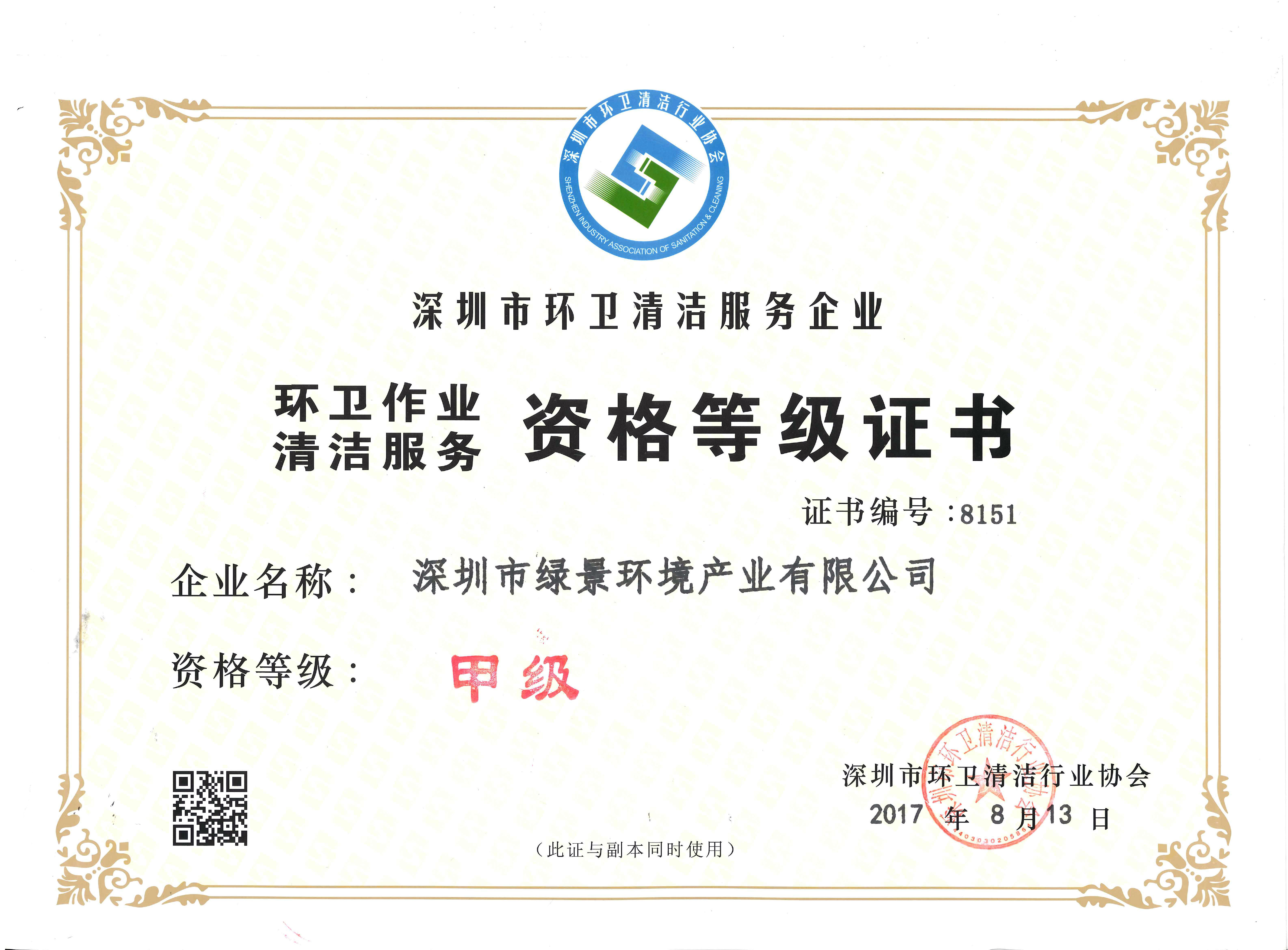环卫清洁服务企业甲级资格等级证书